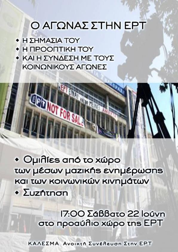 Η Ανοιχτή Συνέλευση της ΕΡΤ οργανώνει συζήτηση το Σάββατο 22 Ιουνίου στις 5 το απόγευμα, στο προαύλιο του Ραδιομεγάρου της ΕΡΤ με θέμα «Ο αγώνας της ΕΡΤ, η σημασία του, η προοπτική του και η σύνδεσή του με τους κοινωνικούς αγώνες».