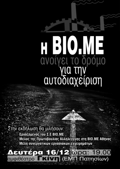 Εδώ και 3 χρόνια οι εργάτες της ΒΙΟ.ΜΕ δίνουν ένα πρωτόγνωρο αγώνα αξιοπρέπειας, έναν αγώνα επιβίωσης. Με το σύνθημα «Αν δε μπορείτε εσείς, μπορούμε εμείς» εδώ και ένα χρόνο επαναλειτουργούν το εργοστάσιο υπό εργατικό έλεγχο δημιουργώντας ένα υπόδειγμα αυτοδιαχείρισης μέσα στις πιο σκληρές συνθήκες εργασιακής βαρβαρότητας.