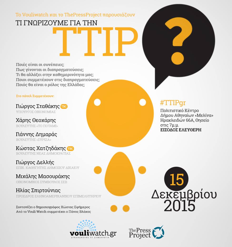 Το Vouliwatch και το ThePressProject σας παρουσιάζουν: Τί γνωρίζουμε για την TTIP; Την Τρίτη, 15 Δεκεμβρίου στις 19.00, σας καλούμε σε ανοιχτή συζήτηση για την Διατλαντική Εταιρική Σχέση Εμπορίου και Επενδύσεων (TTIP)
