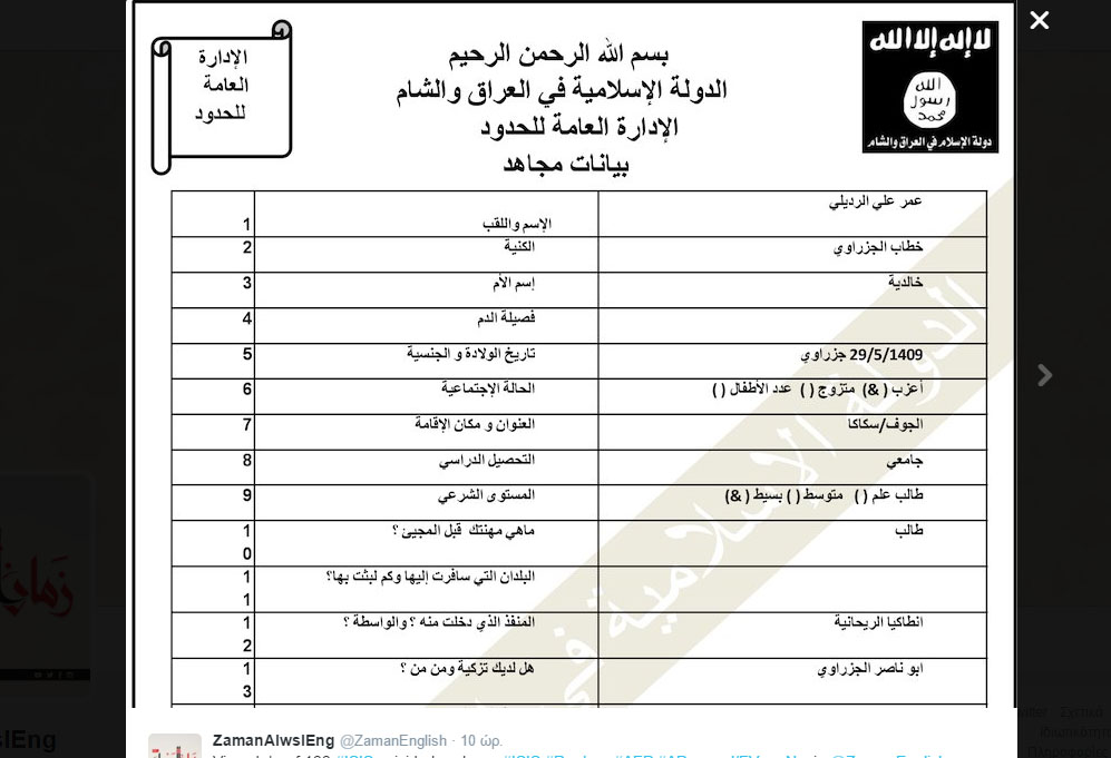 Πρόκειται για τυποποιημένες φόρμες ακριβώς όπως εκείνες που δίνουν οι εταιρίες σε υποψήφιους εργαζόμενους, μόνο που οι συγκεκριμένες, συμπληρώθηκαν από άτομα τα οποία ενδιαφέρθηκαν να ενταχθούν στο Ισλαμικό Κράτος.