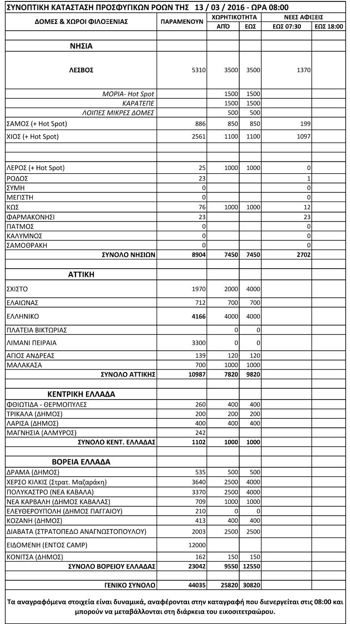 Στον καταυλισμό της Ειδομένης, στα σύνορα της Ελλάδας με την ΠΓΔΜ, διαμένουν περίπου 12.000 άνθρωποι, ενώ σε διάφορα σημεία της Αττικής φιλοξενούνται 10.987 πρόσφυγες. Από αυτούς, οι 4.166 είναι στις εγκαταστάσεις του Ελληνικού και οι 3.300 στο λιμάνι του Πειραιά.