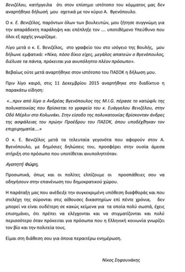 Στο περιοδικό «Επίκαιρα» του εκδότη κ. Λιβάνη δημοσιεύεται επιστολή του κ. Ν. Σηφουνάκη προς την κα Φώφη Γεννηματά με την οποία διαμαρτύρεται γιατί οι βουλευτές της Δημοκρατικής Συμπαράταξης ΠΑΣΟΚ – ΔΗΜΑΡ και μεταξύ αυτών ο Ευ. Βενιζέλος ασκούν κοινοβουλευτικό έλεγχο στην κυβέρνηση και πιο συγκεκριμένα στον Αναπληρωτή Υπουργό Δικαιοσύνης κ. Δ. Παπαγγελόπουλο με αφορμή μηνυτήρια αναφορά εισαγγελέως εφετών που καταγγέλλει πιέσεις και εκβιασμούς κατά την εκτέλεση των δικαστικών της καθηκόντων.