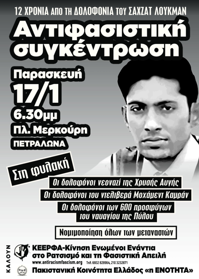 Ήταν Τρίτη 17 Ιανουαρίου του 2013, όταν οι πλέον καταδικασμένοι Χρυσαυγίτες Διονύσης Λιακόπουλος και Χρήστος Στεργιόπουλος σκότωσαν τον εργαζόμενο μετανάστη από το Πακιστάν Σαχζάτ Λουκμάν.