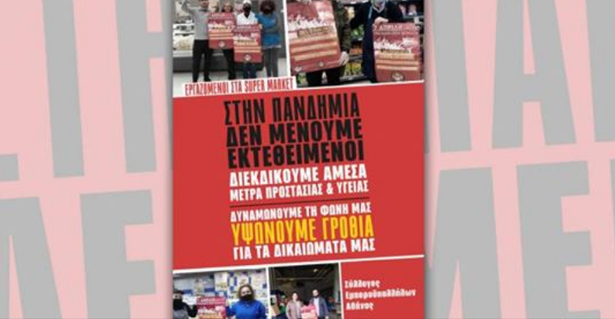 Καλούμε τους συναδέλφους μας στα super market, σημειώνεται, «να έρθουν σε επαφή με τα σωματεία τους. Να υψώσουν ανάστημα και γροθιά για να υπερασπιστούν τη ζωή τους, τη ζωή των οικογενειών τους. Να βάλουν μπροστά τα ζητήματα προστασίας της υγείας τους, των δικαιωμάτων τους».