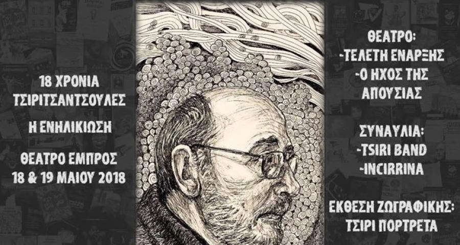Οι Τσιριτσάντσουλες συμπληρώνουν φέτος τα 18 τους χρόνια και σας περιμένουν την Παρασκευή 18 Μαΐου και Σάββατο 19 Μαΐου να γιορτάσετε μαζί τους την ενηλικίωση τους στο ελεύθερο αυτοδιαχειριζόμενο θέατρο ΕΜΠΡΟΣ, με θέατρο, συναυλίες και έκθεση ζωγραφικής. «Αγαπημένοι φίλοι δεν είμαι πια παιδί. Ενηλικιώθηκα!»