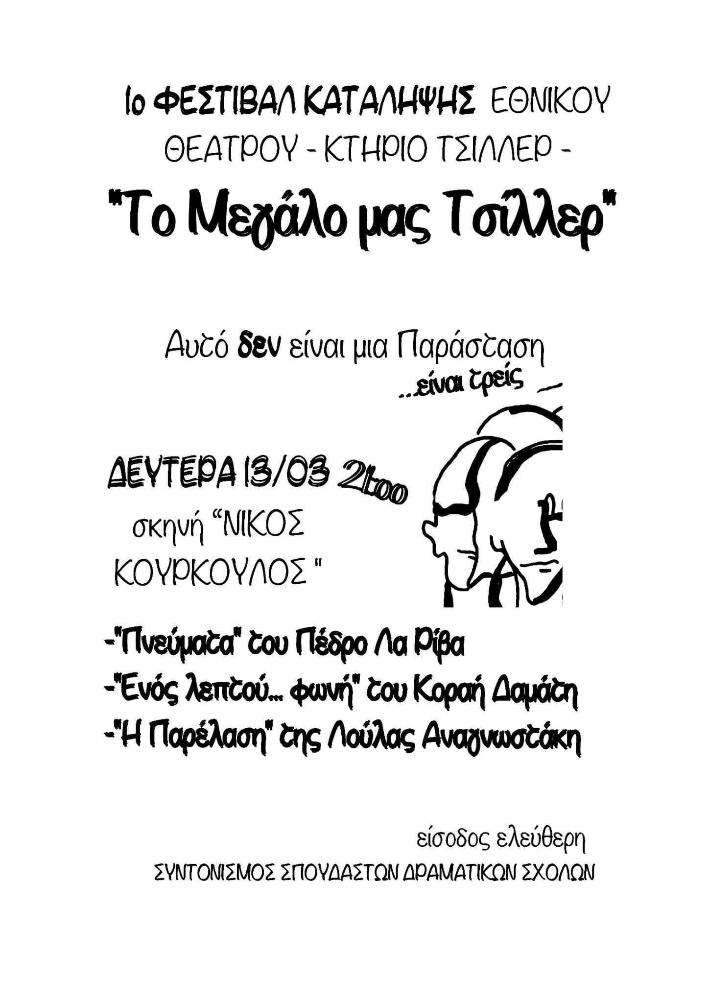 «Το σώμα συντονισμού της κατάληψης του Τσίλλερ είναι στην ευχάριστη θέση να ανακοινώσει το σημερινό κάλεσμα στο 1ο του Φεστιβάλ. Οι παραστάσεις θα ξεκινήσουν στις 21:00 και θα έχουν συνολική διάρκεια 1 ώρα και 40 λεπτά χωρίς ενδιάμεσο διάλειμμα. Κατά τη διάρκεια τους γίνεται χρήση έντονων φλας φωτισμών και δυνατών ήχων. Η αίθουσα έχει χωρητικότητα 180 ατόμων και η είσοδος θα είναι με ελεύθερη συνεισφορά για την οικονομική ενίσχυση της κατάληψης.