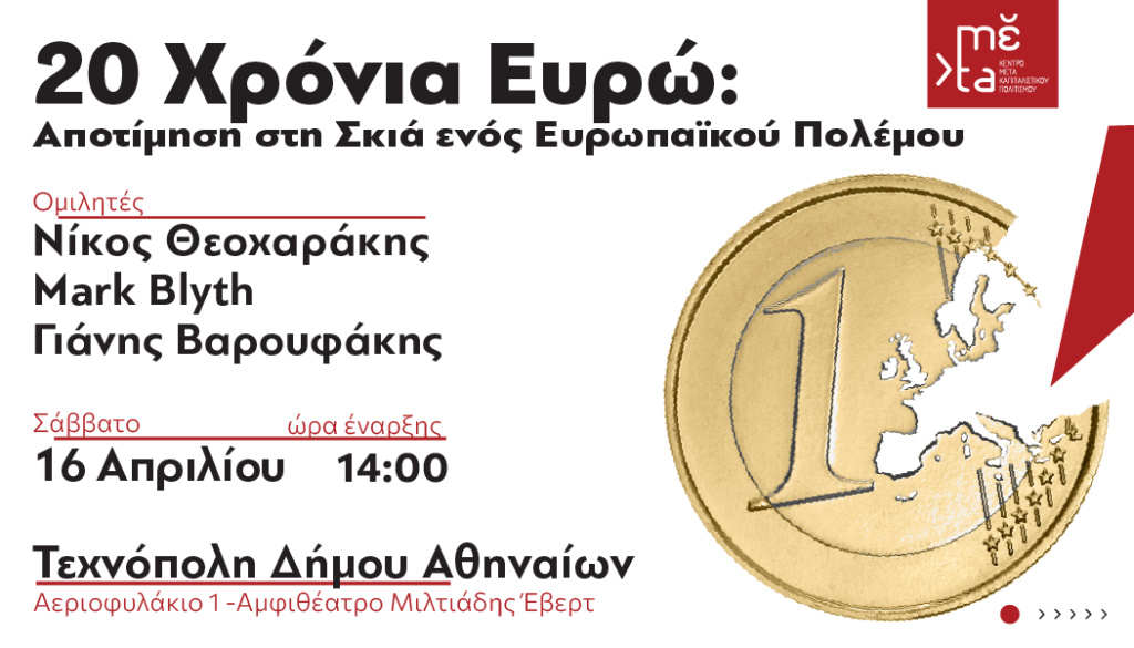 «Η εισαγωγή του ευρώ (η κυκλοφορία του οποίου στη χώρα μας συμπλήρωσε ακριβώς είκοσι χρόνια) παρουσιάστηκε ως υπόσχεση σύγκλισης και ευημερίας – και ως επέκταση της ακόμα πιο μεγάλης υπόσχεσης για Ειρήνη στη Γηραιά Ήπειρο. Όμως, όπως γνωρίζουμε καλά, το ευρώ διαίρεσε αντί να ενώσει και μάλιστα ενεργοποίησε φυγόκεντρες δυνάμεις που μάλλον απέτρεψαν την ενοποίηση που θα απαιτούσε και μια κοινή αμυντική/εξωτερική πολιτική της ΕΕ. Σήμερα, με τη μεγαλύτερη εδώ και δεκαετίες πολεμική αναμέτρηση επί ευρωπαϊκού εδάφους σε εξέλιξη, η κριτική αποτίμηση της εικοσαετούς ιστορίας του ευρώ καθίσταται περισσότερο αναγκαία από ποτέ. Στην ημερίδα που διοργανώνει το mέta (το Κέντρο Μετά Καπιταλιστικού Πολιτισμού) στις 16 Απριλίου στην “Τεχνόπολη” του Δήμου Αθηναίων στο Γκάζι εξετάζεται η πορεία προς την καθιέρωση του ευρώ, η λειτουργία του κατά τα πρώτα 20 χρόνια, οι ιδεολογικές, πολιτιστικές και γεωπολιτικές διαστάσεις του κοινού νομίσματος, ενώ ιχνηλατούνται και εναλλακτικές στην εποχή του ψηφιακού χρήματος» αναφέρει το σημείωμα των διοργανωτών.