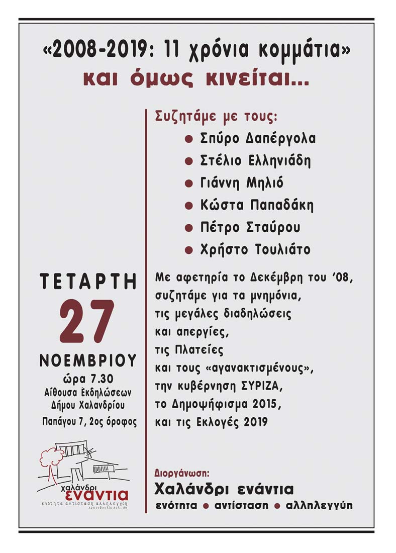 Μιλώντας για μια διαδρομή που ξεκινά από τον Δεκέμβρη του '08, περνά από τους Αγανακτισμένους, το δημοψήφισμα και φτάνει μέχρι το σήμερα, η δημοτική κίνηση «Χαλάνδρι ενάντια» διοργανώνει μια συζήτηση που συγκεντρώνει ενδιαφέρουσες ομιλίες από διαφορετικούς πολιτικούς χώρους της Αριστεράς.