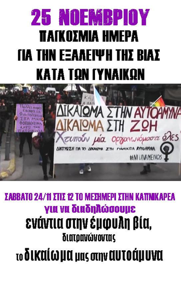 Πορεία στο κέντρο της Αθήνας πραγματοποιήθηκε χτές Σάββατο 24 Νοεμβρίου, κατά της έμφυλης βίας από γυναικείες,φεμινιστικές και lgbtq συλλογικότητες, καθώς και με συμμετοχή της Ομάδας συλλογικών δράσεων και Κοινωνικής Αλληλεγγύης για το 18 ΑΝΩ