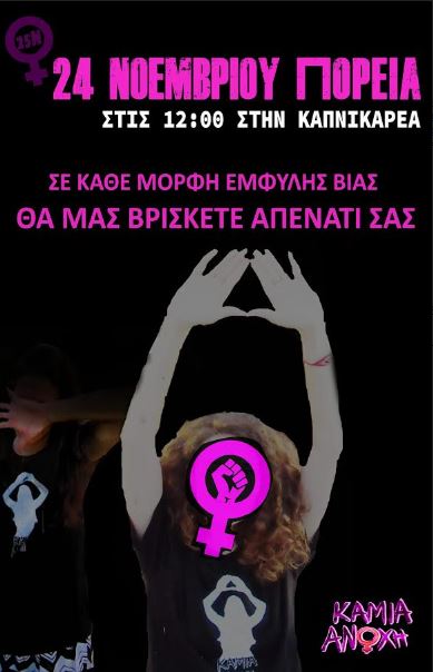 Πορεία στο κέντρο της Αθήνας πραγματοποιήθηκε χτές Σάββατο 24 Νοεμβρίου, κατά της έμφυλης βίας από γυναικείες,φεμινιστικές και lgbtq συλλογικότητες, καθώς και με συμμετοχή της Ομάδας συλλογικών δράσεων και Κοινωνικής Αλληλεγγύης για το 18 ΑΝΩ