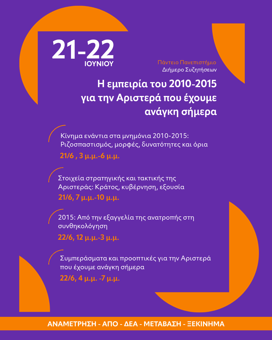 Πέντε οργανώσεις της εξωκοινοβουλευτικής αριστεράς Αναμέτρηση - ΑΠΟ - ΔΕΑ - Μετάβαση και Ξεκίνημα, οργανώνουν διήμερο εκδηλώσεων - συζητήσεων με τίτλο «Η εμπειρία του 2010 – 2015, για την Αριστερά που έχουμε ανάγκη σήμερα» 21 και 22 Ιουνίου στο Πάντειο Πανεπιστήμιο. «Θέλουμε να συζητήσουμε όχι επετειακά, αλλά για να βγάλουμε συμπεράσματα για τα επόμενα βήματά μας» τονίζουν οι διοργανώτριες συλλογικότητες στο κάλεσμά τους.