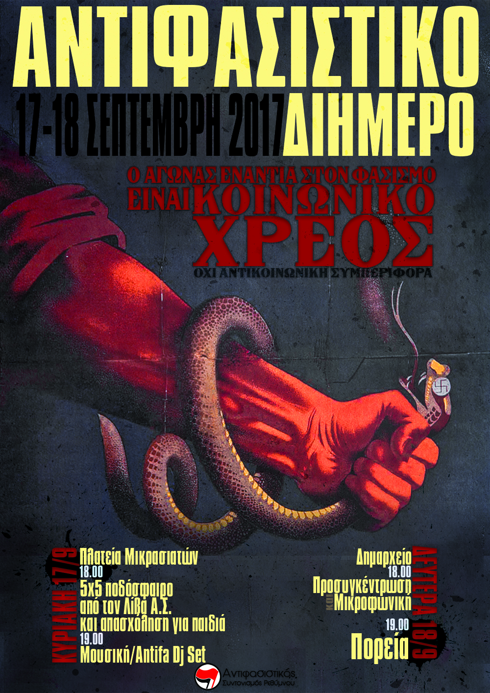 Στα πλαίσια αυτού του αγώνα εντάσσεται και το Αντιφασιστικό διήμερο στις 17-18 Σεπτεμβρίου. Η μνήμη μας είναι ζωντανή. Θυμόμαστε καλά τους νεκρούς μας. Τον Έντισον Γιαχάι, δολοφονημένο από φασίστες της Ο.Ε.Ρ. στο Ρέθυμνο το 2006. Το Σαχζάτ Λουκμάν, δολοφονημένο από φασίστες της Χρυσής Αυγής το 2013. Τον Παύλο Φύσσα.