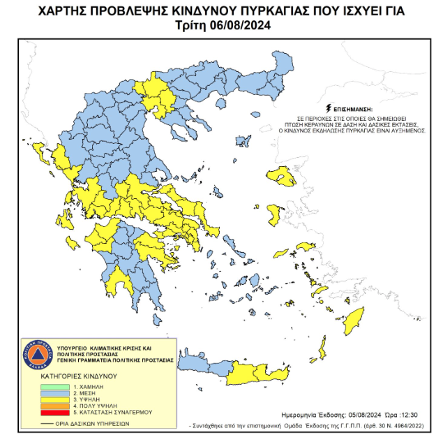 Yψηλός κίνδυνος πυρκαγιάς (κατηγορία κινδύνου 3) προβλέπεται για σήμερα Τρίτη σε αρκετές Περιφέρειες της χώρας, σύμφωνα με το Χάρτη Πρόβλεψης Κινδύνου Πυρκαγιάς της Γενικής Γραμματείας Πολιτικής Προστασίας του υπουργείου Κλιματικής Κρίσης και Πολιτικής Προστασίας.
