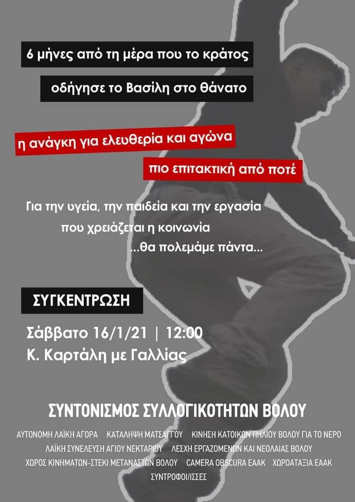 Έξι μήνες έχουν περάσει από την απροειδοποίητη αναχώρηση στις 13 Ιούλη 2020 του σ. Βασίλη Μάγγου. Επτά μήνες από το βίαιο ξυλοδαρμό του μπροστά στα δικαστήρια Βόλου στις 14 Ιούνη, την κακοποίησή του μέσα στο όχημα της ασφάλειας και το βασανισμό του στην αστυνομική Διεύθυνση Μαγνησίας. Μια μέρα πριν, 13 Ιούνη, είχε προηγηθεί μεγάλη διαδήλωση κατά της καύσης σκουπιδιών που είχε ξεκινήσει από το Νοσοκομείο του Βόλου, πορεύτηκε προς το εργοστάσιο της ΑΓΕΤ αλλάζοντας την πολυετή ατζέντα των διαμαρτυριών, προβάλλοντας το κεντρικό αίτημα να φύγει η ΑΓΕΤ από την πόλη.