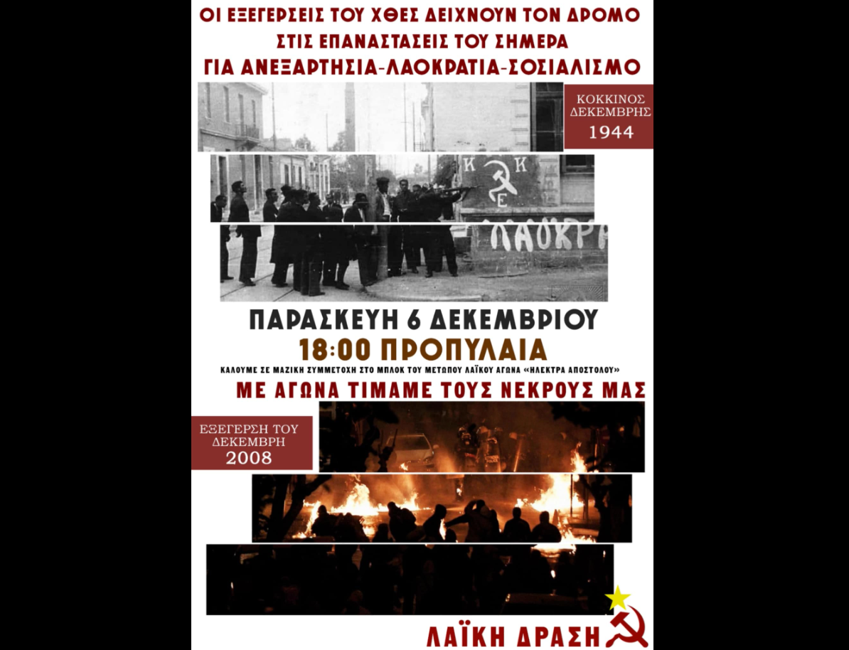 Πλάι στον Σωτήρη Πέτρουλα, τον Ιάκωβο Κουμή, την Σταματίνα Κανελλοπούλου, τον Μιχάλη Καλτεζά, τον Σιδέρη Ισιδωρόπουλο και στους χιλιάδες νεκρούς του λαϊκού κινήματος που φωτίζουν τους αγώνες του λαού, της εργατικής τάξης και της νεολαίας, αδημονούν για δικαίωση για τους ανεκπλήρωτους Δεκέμβρηδες.16 χρόνια μετά την εξέγερση και 80 χρόνια μετά τον Κόκκινο Δεκέμβρη του επαναστατικού ΚΚΕ με αιχμή τον ένοπλο αγώνα του ΕΑΜ-ΕΛΑΣ-ΕΠΟΝ-ΟΠΛΑ στους δρόμους της αθηναϊκής μητρόπολης, βρισκόμαστε μέσα στο πλαίσιο της δομικής κρίσης που βοά το σύστημα με τον παγκόσμιο πόλεμο να είναι προ των πυλών από την τυχοδιωκτική-φιλοπόλεμη δράση του μοναδικού επιτιθέμενου ιμπεριαλιστικού άξονα των ΗΠΑ-ΝΑΤΟ-ΕΕ για να ξεζουμίσουν τις πλουτοπαραγωγικές πηγές του πλανήτη, οι ανεκπλήρωτοι πόθοι των Δεκέμβρηδων στέκουν εδώ και είναι ζωντανοί!