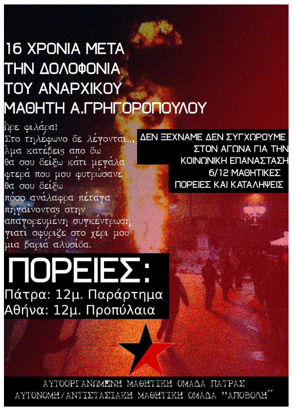 Συμπληρώνονται 16 χρόνια από την κρατική δολοφονία του αναρχικού-αγωνιστή μαθητή Αλέξανδρου Γρηγορόπουλου από τους φονιάδες συμμορίτες της ΕΛ.ΑΣ. Επαμεινώνδα Κορκονέα και Βασίλη Σαραλιώτη.