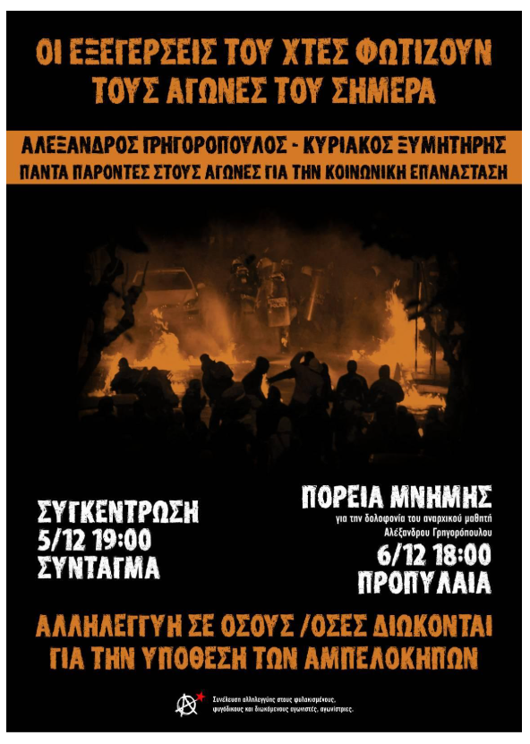 Ταυτόχρονα οι ιδεολογικοί και κατασταλτικοί μηχανισμοί του κράτους επιχειρούν το παραδειγματικό χτύπημα του αναρχικού κινήματος γιατί υπήρξε βασικός εκφραστής, όλη την μεταπολιτευτική περίοδο, των αδιαμεσολάβητων και ριζοσπαστικότερων κοινωνικών και ταξικών αγώνων. Αυτό αναδεικνύεται σήμερα μέσα από την εν εξελίξει κρατική επιχείρηση τρομοκρατίας, που ξεκίνησε με αφορμή την έκρηξη στους Αμπελόκηπους και τον θάνατο του αναρχικού Κυριάκου Ξυμητήρη, και η οποία επιδιώκει να κατασκευάσει ενόχους και να οδηγήσει αγωνιστές στον εγκλεισμό και την εξουδετέρωσή τους από το πεδίο του κοινωνικού και ταξικού αγώνα, όπως οι προφυλακίσεις των αγωνιστών/τριών Μαριάννα Μ, Νίκου Ρωμανού, Δήμητρας Ζ. και Δημήτρη Π., το συντονισμένο τρομολαγνικό σόου που εκπορεύεται από τα αστυνομικά επιτελεία και διαχέεται στα μιντιακά φερέφωνα της εξουσίας, η ποινικοποίηση των φιλικών και συντροφικών σχέσεων, μέχρι και η αστυνομική αυθαιρεσία που εκφράστηκε πάνω στην αναρχική αγωνίστρια Μαριάννα Μ. με τη λήψη αποτυπωμάτων ενόσω βρισκόταν βαριά τραυματισμένη και χωρίς τις αισθήσεις της και την επιχείρηση των ανακριτικών αρχών να της αποσπάσουν απολογία. Η κατασταλτική εκστρατεία του κράτους απέναντι στο αναρχικό κίνημα, η οποία σήμερα διαρκώς κλιμακώνεται, δεν αποτελεί κάποιου είδους αποπροσανατολισμό ούτε είναι παράγωγο της συγκυρίας, αλλά πάγιος και διακηρυγμένος στόχος του κράτους ειδικά μετά την εξέγερση του 08′ και αυτό διότι το αναρχικό κίνημα δεν έδωσε ποτέ συγχωροχάρτι σε κράτος και αφεντικά, αλλά αντιθέτως παρά την καταστολή, τη συκοφάντηση, το ξύλο, τις διώξεις και τις φυλακές παρέμεινε να αγωνίζεται κόντρα σε κάθε εξουσία, κόντρα στην εκμετάλλευση και καταπίεση, κόντρα στις λογικές ανάθεσης, διαμεσολάβησης και συμβιβασμού.