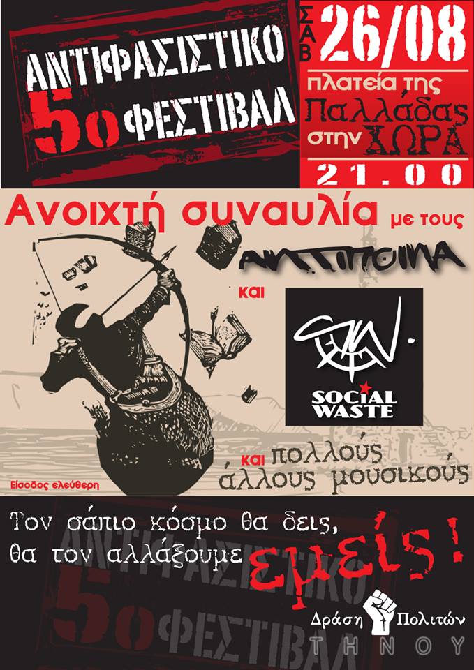 Με μια βραδιά μουσικής συναυλίας (26/08/2017) και μία βραδιά προβολής ταινίας και συζήτησης (27/08/2017) η Χώρα της Τήνου θα νιώσει την παρουσία του κόσμου του αντιφασιστικού κινήματος στην καρδιά της πόλης.