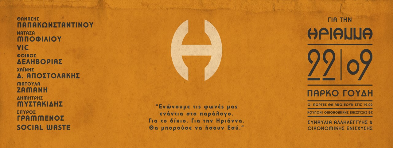 Την Παρασκευή 22 Σεπτέμβρη θα πραγματοποιηθεί συναυλία αλληλεγγύης και οικονομικής ενίσχυσης για την υπόθεση τής Ηριάννας Β.Λ. στο πάρκο Γουδή. «Ενώνουμε τις φωνές μας ενάντια στο παράλογο. Για το δίκιο. Για την Ηριάννα. Θα μπορούσες να ήσουν Εσύ», αναφέρεται στο σχετικό κάλεσμα που γίνεται μέσω διαδικτύου. Οι πόρτες ανοίγουν στις 19:00 ενώ θα διατίθενται κουπόνια οικονομικής ενίσχυσης με το συμβολικό αντίτιμο των 5 ευρώ.