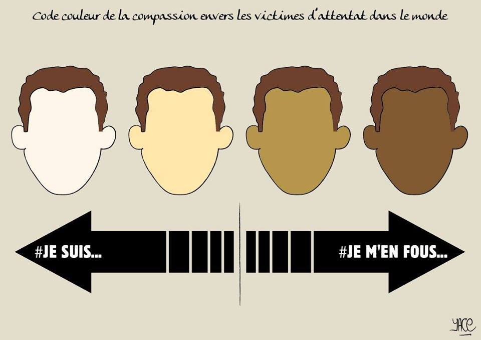 «Από το “Είμαι κι εγώ…” στο “Δε με νοιάζει”: Η κλίμακα του χρώματος του δέρματος που καθορίζει την συμπόνοια μας για τα θύματα στον κόσμο». Σκίτσο που κάνει τον γύρο των κοινωνικών δικτύων με αφορμή την αδιαφορία της Δύσης για την επίθεση στη Σομαλία.