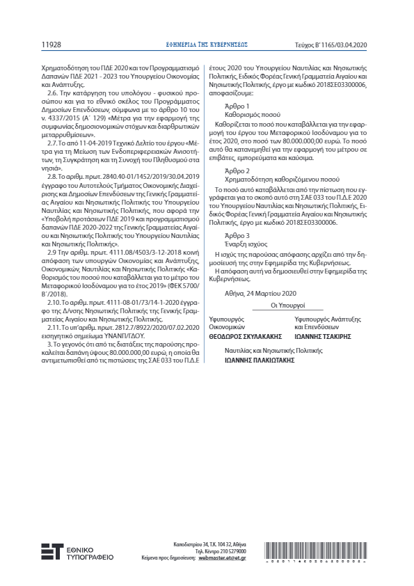 Καθορίζεται το ποσό που καταβάλλεται για την εφαρμογή του έργου του Μεταφορικού Ισοδύναμου για το έτος 2020, στο ποσό των 80.000.000,00 ευρώ. Το ποσό αυτό θα κατανεμηθεί για την εφαρμογή του μέτρου σε επιβάτες, εμπορεύματα και καύσιμα.