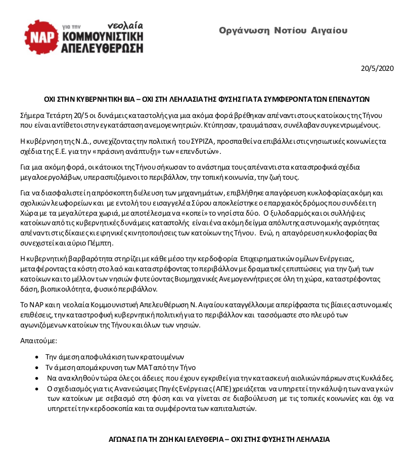 Στην Τήνο, το κράτος όχι μόνο αδιαφορεί για το λαϊκό αίσθημα που έχει εκδηλωθεί ηχηρά ενάντια στη βιομηχανία των αιολικών, αλλά επιστρατεύει και την καταστολή για να επιβάλλει στην τοπική κοινωνία τα συμφέροντα των μεγαλοεπενδυτών και των πολυεθνικών της ενέργειας με τις θυγατρικές τους. Εξάλλου, η κυβέρνηση με την πρόσφατη ψήφιση του αντιπεριβαλλοντικού νόμου έχει αποδείξει ότι, όχι μόνο συσστρατεύεται, αλλά και διευκολύνει τους επενδυτές στη ληστρική εκμετάλλευση και τη λεηλασία της φύσης.
