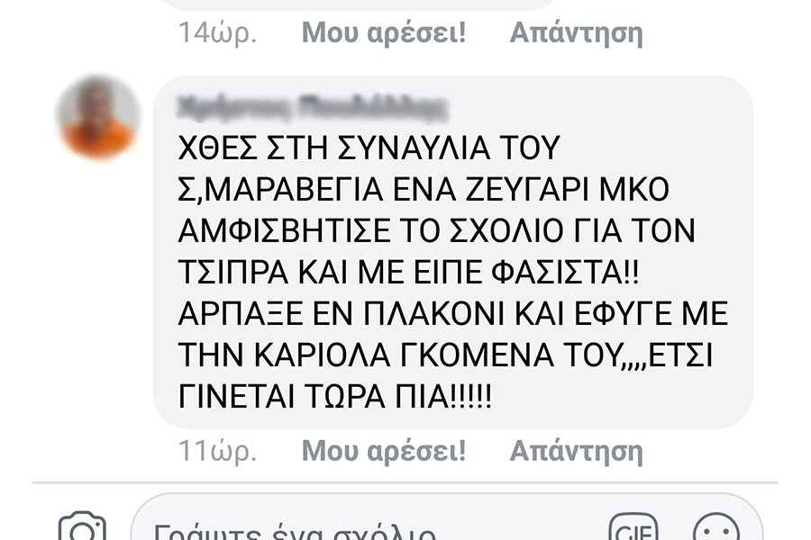 Ας σημειωθεί ότι ο νταής έχει πρωταγωνιστήσει επανειλημμένα σε βίαια επεισόδια σε βάρος πολιτών. Χαρακτηριστικό και αποδεικτικό πως ό,τι έγινε την Παρασκευή το βράδυ δεν ήταν «κεραυνός εν αιθρία», το περιστατικό που έχει δημοσιοποιήσει ο ίδιος μέσα από τον προσωπικό του λογαριασμό στο Facebook. Σύμφωνα με τα όσα χαρακτηριστικά του ύφους του, ο ίδιος γράφει στη συναυλία του Μαραβέγια (σ.σ. πριν από δυο χρόνια στο κάστρο της Μυτιλήνης) «ένα ζευγάρι ΜΚΟ αμφισβήτησε το σχόλιο για τον Τσίπρα και με είπε φασίστα. Άρπαξε ένα πλακόνι και έφυγε με την καργιόλα γκόμενα του… Έτσι θα γίνεται τώρα πια!!!».
