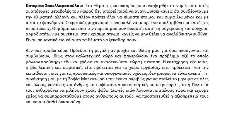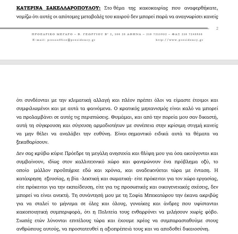 Συγκεκριμένα, η είπε αναφερόμενη στην κακοκαιρία: «Στο θέμα της κακοκαιρίας που αναφερθήκατε, νομίζω ότι αυτές οι απότομες μεταβολές του καιρού δεν μπορεί παρά να αναγνωρίσει κανείς ότι συνδέονται με την κλιματική αλλαγή και πλέον πρέπει όλοι να είμαστε έτοιμοι και συμφιλιωμένοι και με αυτά τα φαινόμενα. Ο κρατικός μηχανισμός είναι πάρα πολύ καλό να μπορεί να προλαμβάνει σε αυτές τις περιπτώσεις. Θυμάμαι, και από την πορεία μου σαν δικαστή, αυτή τη σύγκρουση και σύγχυση αρμοδιοτήτων με συνέπεια στην κρίσιμη στιγμή κανείς να μην θέλει να αναλάβει την ευθύνη. Είναι πολύ σημαντικά αυτά τα θέματα να ξεκαθαρίσουν. Βέβαια ευτυχώς δεν ήταν μεγάλης έντασης το φαινόμενο, τέτοιας διάρκειας τουλάχιστον και μπορούμε σιγά σιγά να επανέλθουμε». Η τελευταία φράση, παρόλο που ακούγεται και στο σχετικό βίντεο που δόθηκε στη δημοσιότητα από το κανάλι στο Youtube του πρωθυπουργού δεν υπάρχει σε κανένα επίσημο Δελτίο Τύπου.