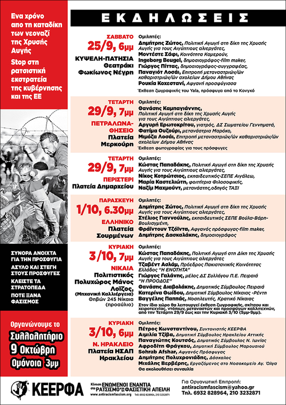 Η Κίνηση Ενωμένοι Ενάντια στο Ρατσισμό και τη Φασιστική Απειλή (ΚΕΕΡΦΑ) με αφορμή την ιστορική απόφαση της 7ης Οκτωβρίου καλεί σε μεγάλο συλλαλητήριο στις 9 Οκτωβρίου. Το αρχικό κάλεσμα στηρίζουν και τοπικές επιτροπές Νίκαιας, Πειραιά, Κυψέλης-Πατησίων, Αμπελοκήπων, Εξαρχείων, Πετραλώνων, Κουκακίου, Καλλιθέας, Νοτίων Αθήνας, Ν.Σμύρνης, Ιλισίων-Ζωγράφου, Περιστερίου, Ν.Ιωνίας, Αμαρουσίου, Ιλίου Πετρούπολης κα, η Πακιστανική Κοινότητα Ελλάδος “η Ενότητα”, η Κοινότητα Μπαγκλαντές, η Κοινότητα Καμερουνέζων στην Ελλάδα, η Κοινότητα Γουϊνέας, Πρόσφυγες από τα στρατόπεδα του Σχιστού, της Μαλακάσας, του Ελαιώνα, της Ριτσώνας, της Κορίνθου, Κούρδοι πολιτικοί πρόσφυγες, το Δίκτυο Αφρικανικών οργανώσεων, η Πολιτική Αγωγή στη δίκη της Χρυσής Αυγής για τους Αιγύπτιους αλιεργάτες, συνδικάτα, ο Σύλλογος εργαζόμενων νοσοκομείου Άγιος Σάββας, οι Σύλλογοι εκπαιδευτικών ΠΕ Αμαρουσίου και Αιγάλεω, συντονιστές εκπαίδευσης στα καμπ, οι Παιδαγωγοί της Αλληλεγγύης, Φοιτητικοί σύλλογοι Αθήνας, η Κίνηση καλλιτεχνών με αναπηρία ¨Μηδενική Ανοχή”, η Ανατρεπτική Συσπείρωση Ηθοποιών, Πρωτοβουλία φοιτητών ΤΕΑΠΗ, μαθητές σχολείων Αθήνας, αγωνιστές του ΣΦΕΑ, ομάδα δημοσιογράφων με επικεφαλής την Ινγκεμποργκ Μπέιλεν και δημοτικές κινήσεις.