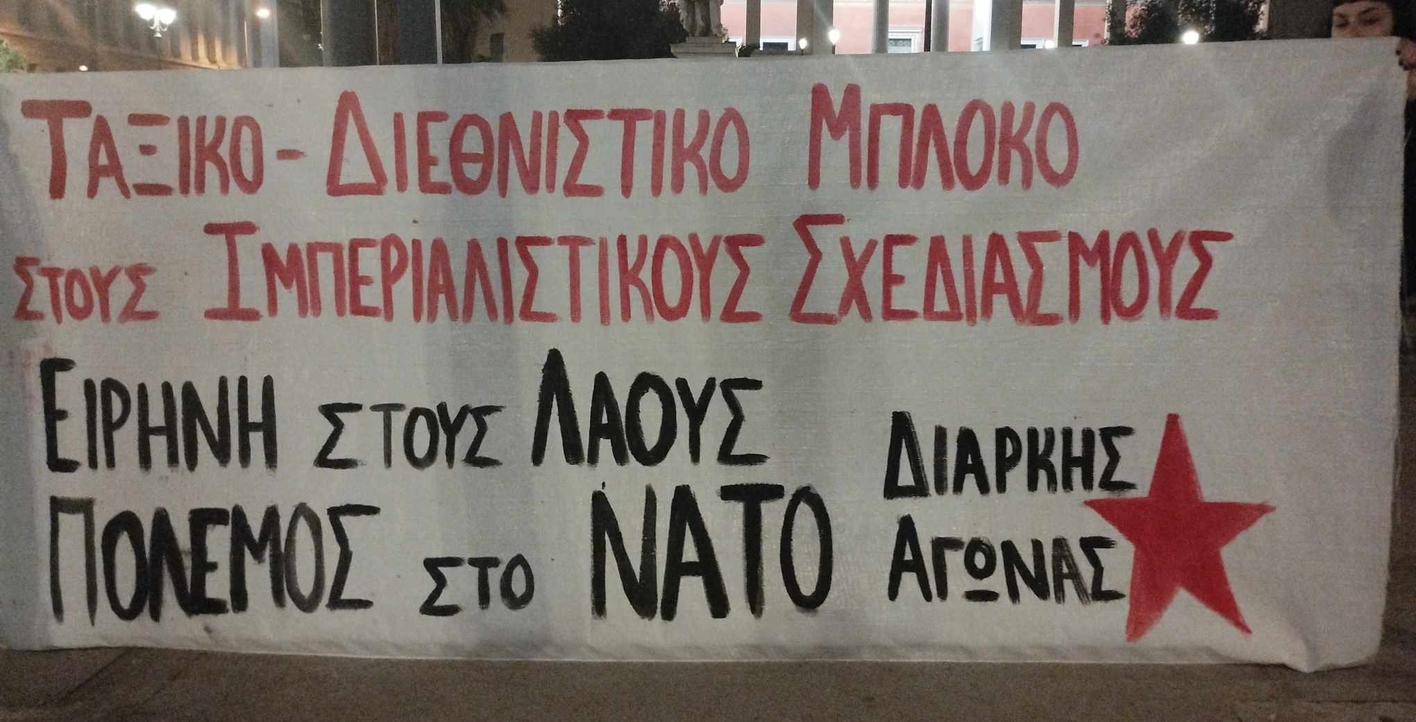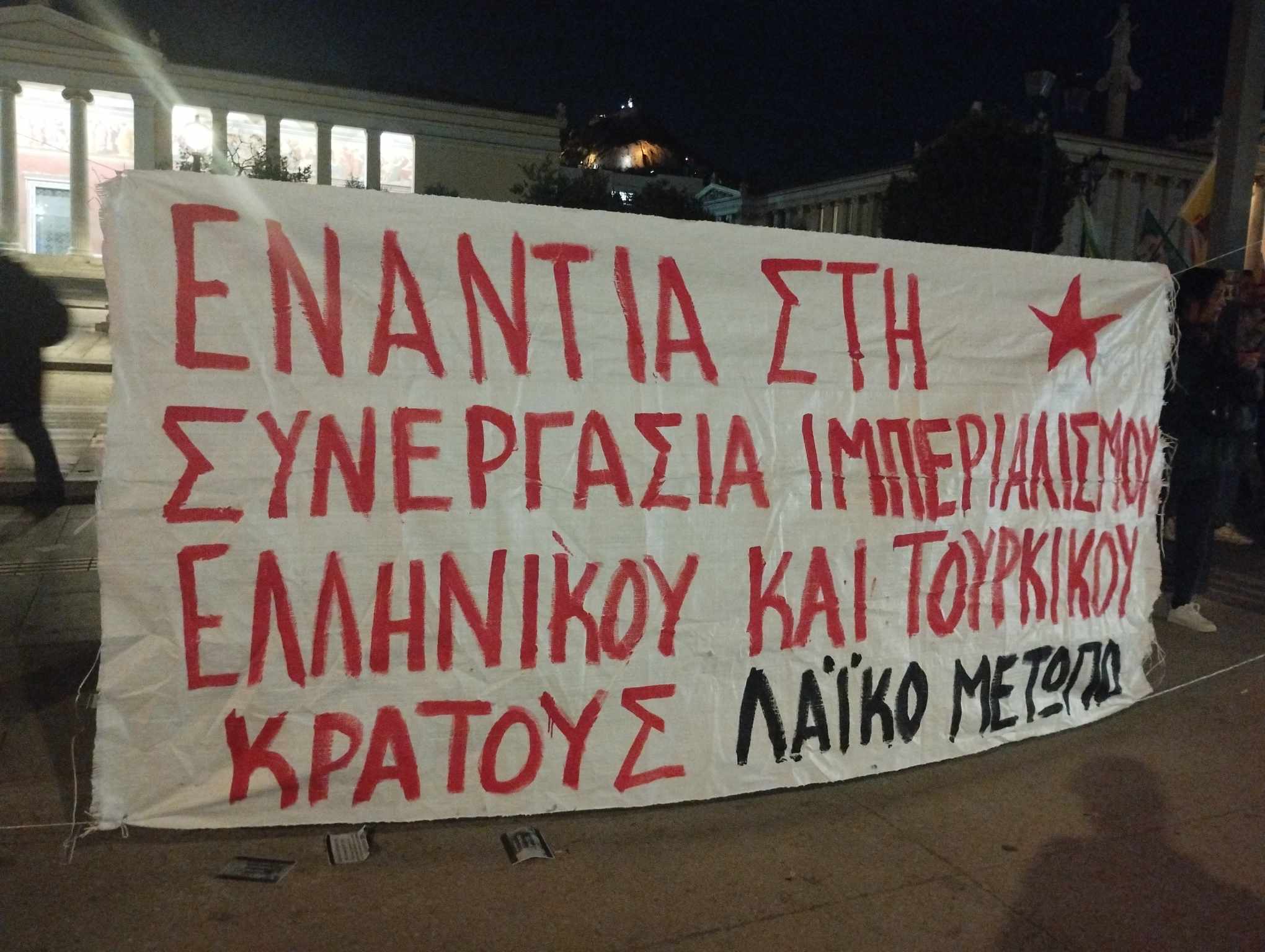 Οι συγκεντρωμένοι φώναξαν συνθήματα ενάντια στα εγκλήματα του ιμπεριαλισμού και τις εγκληματικές και αντιλαϊκές πολιτικές των δύο κυβερνήσεων. «Ειρήνη στο Αιγαίο, πόλεμος στο ΝΑΤΟ, ζητώ το παγκόσμιο προλεταριάτο», «Τόσα χρόνια ΝΑΤΟ η ίδια ιστορία, χούντες πολέμοι, τρομοκρατία» και «Η αλληλεγγύη το όπλο των λαών πολέμος στον πόλεμο των ιμπεριαλιστών» ήταν μερικά συνθήματα που ακούστηκαν.