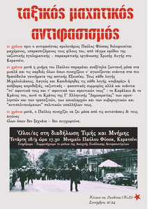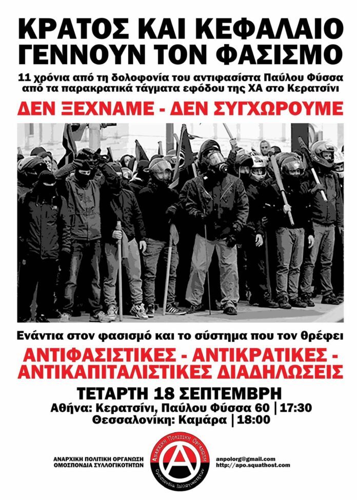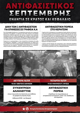 «Στις 16/9 και στις 18/9, το αντιφασιστικό κίνημα έχει μπροστά του δυο σημαντικές στιγμές αγώνα. Στις 16 ξεκινά και πάλι το δικαστήριο των δυο αντιφασιστών που διώκονται για τις επιθέσεις σε γραφεία της Χ.Α. και στις 18 θα πραγματοποιηθεί, όπως κάθε χρόνο εδώ και 11 χρόνια, η μεγάλη αντιφασιστική πορεία στο Κερατσίνι, στη μνήμη του αντιφασίστα Παύλου Φύσσα. Ο κόσμος του αντιφασιστικού, αντικρατικού, αντικαπιταλιστικού αγώνα πρέπει και θα είναι παρών και στις δυο αυτές μέρες. Μέσα κι έξω από τα δικαστήρια της Λουκάρεως, στους δρόμους του Κερατσινίου.