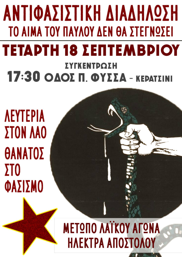 Όλοι & Όλες στη Διαδήλωση Τιμής και Μνήμης την Τετάρτη 18/9 στις 17.30 στο Μνημείο Παύλου Φύσσα στο Κερατσίνι. Στηρίζουμε – Συμμετέχουμε στο μπλοκ της Ανοιχτής Συνέλευσης Αντιφασιστ(ρι)ών».