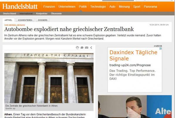 Handelsblatt:Πριν από την επίσκεψη Μέρκελ: Παγιδευμένο αυτοκίνητο εξερράγη κοντά στην ελληνική κεντρική τράπεζα.