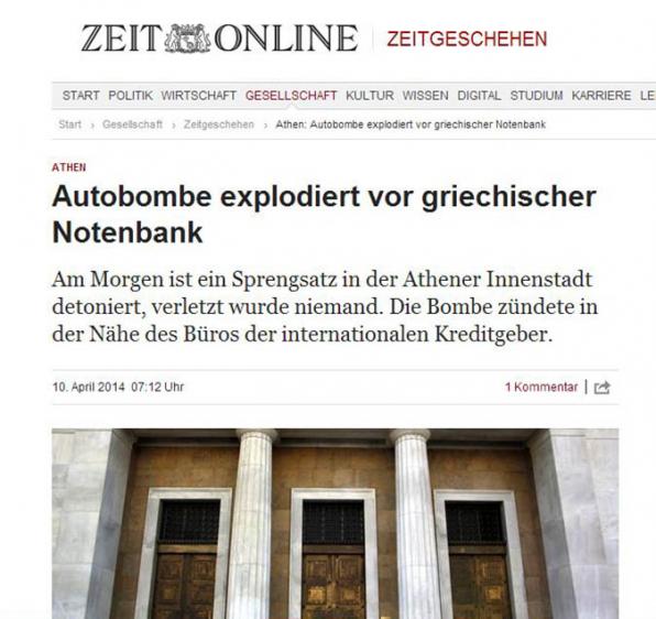 Die Zeit: Εκρηξη παγιδευμένου αυτοκινήτου έξω από την Τράπεζα της Ελλάδος