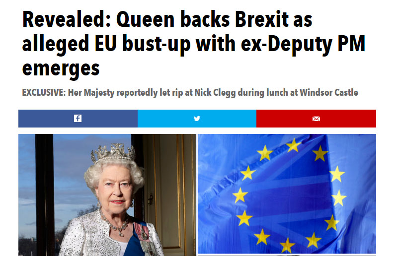 Το επίμαχο πρωτοσέλιδο της Sun η οποία αξίζει να σημειωθεί πως είναι η εφημερίδα με τη μεγαλύτερη κυκλοφορία στη Βρετανία, έλεγε συγκεκριμένα πως «η βασίλισσα υποστηρίζει το Brexit, χαρακτηρίζοντας μάλιστα το συγκεκριμένο δημοσίευμα ως «αποκλειστικό», επικαλούμενη δε δυο πηγές.