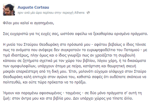 Μέσω της προσωπικής σελίδας του στο facebook, ο Αύγουστος Κορτώ ξεκαθαρίζει πως δεν σκοπεύει να πολιτευθεί:
