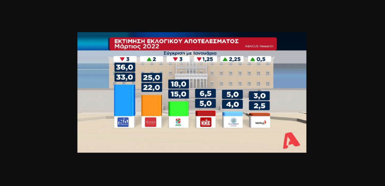 Ενόσω όλες οι δημοσκοπικές εταιρίες βρίσκουν ότι η διαφορά ανάμεσα σε ΝΔ και ΣΥΡΙΖΑ είναι μονοψήφια, η Abacus έδωσε χτες διαφορά 11 μονάδες. Και μάλιστα χρησιμοποιεί όχι ακριβείς αριθμούς, αλλά διαστήματα ποσοστών, ώστε να είναι «καλυμμένη» σε περίπτωση που το εκλογικό αποτέλεσμα είναι τελείως διαφορετικό.