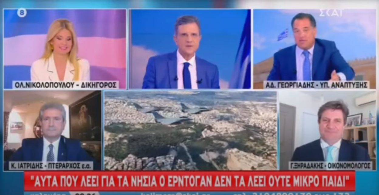 Ο υπουργός Ανάπτυξης βρέθηκε στο πλατό του ΣΚΑΪ καλεσμένος στην εκπομπή του Γιώργου Αυτιά και μίλησε για τις τελευταίες εξελίξεις στα ελληνοτουρκικά. «Βλέπετε πώς ο Ερντογάν και όλη η τουρκική ηγεσία αναφέρονται στον πρωθυπουργό. Αν τους εξυπηρετούσε η πολιτική Μητσοτάκη, θα τον έβριζαν από το πρωί μέχρι το βράδυ; Ο Ερντογάν έχει βρει τον δάσκαλό του στον Μητσοτάκη, γι’ αυτό βράζει όλη μέρα ο άνθρωπος», σημείωσε ο κ. Γεωργιάδης και εξήγησε: «Πήρε τα Rafale και βγαίνουν όλοι στις τηλεοράσεις στην Τουρκία και λένε ότι η Ελλάδα έχει αποκτήσει αεροπορική υπεροχή, πήρε τις φρεγάτες και μόλις τις παραλάβουμε θα κερδίζουμε και στον στόλο, έφτιαξε τις διεθνείς συμμαχίες με την Αμερική, τη Γαλλία, τη Γερμανία, τα Ηνωμένα Αραβικά Εμιράτα, το Ισραήλ, δεν κουνιέται κανένας εναντίον της Ελλάδας».