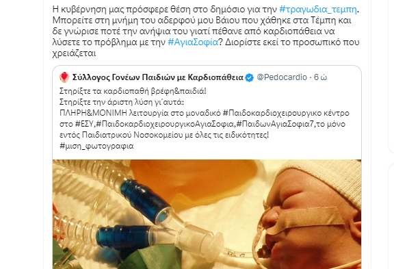 «Στη Λάρισα ήρθατε πρόσωπο με πρόσωπο με τους γονείς μου. Δεν βοηθήσατε εκεί, ο Βάιος χάθηκε. Βοηθήστε την Αγία Σοφία. Εσείς που είστε τώρα και αυτοί που θα είστε μετά. Στη μνήμη της οικογένειας μας, της ανηψιάς του Βάιου που δε γνώρισε ποτέ. Φεβρουάριο έφυγε το μωρό μου, Φεβρουάριο και ο αδερφός μου, Φεβρουάριο και η #CHDweek. Όταν εσείς γιορτάζετε του Α. Βαλεντίνου, εμείς θρηνούμε τα παιδιά μας. Λύστε το τώρα. Προσλάβετε γιατρούς όχι συγγενείς. Και όποιος Υπουργός Υγείας έρθει μετά, δε με ενδιαφέρει τι πρέπει να γίνει, αλλά να γίνει. Ήσουν εκεί, στη Λάρισα και δεν έκανες τίποτα. Κάνε τώρα. Σε παρακαλώ. Σώσε αυτά τα μωρά. Είναι σα να σώζεις την ανιψιά του αδερφού μου. Το ίδιο. Και καλύτερο. Κάντο».