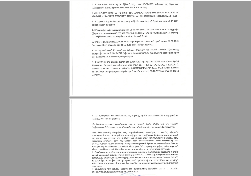 Δυστυχώς γι αυτούς, χρειάστηκαν μόλις δύο ημέρες για να καταρρεύσει το συκοφαντικό και ψευδές αφήγημα της δήθεν λογοκλοπής, αφού με έγγραφο-βεβαίωση που χορηγήθηκε μετά από αίτησή μου, ο πρόεδρος της Ιατρικής Σχολής Αθηνών, καθηγητής κ. Γεράσιμος Σιάσος, χαρακτηρίζει ως ”πρωτότυπη και αυθεντική η αξιολόγηση του ειδικού μέρους της διδακτορικής διατριβής” μου.