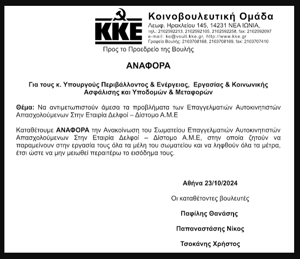 Αντίστοιχα το Κομμουνιστικό Κόμμα Ελλάδος (ΚΚΕ), από την πλευρά του, έχει προχωρήσει σε αναφορά στη Βουλή για τα προβλήματα των Αυτοκινητιστών που απασχολούνται στην εταιρεία «Δελφοί-Δίστομο» προς τους Υπουργούς Περιβάλλοντος & Ενέργειας, Εργασίας & Κοινωνικής Ασφάλισης και Υποδομών & Μεταφορών με θέμα: