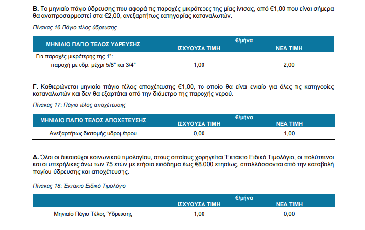 - Το μηνιαίο πάγιο ύδρευσης που αφορά τις παροχές μικρότερες της μίας ίντσας, από 1 ευρώ που είναι σήμερα θα αναπροσαρμοστεί στα 2 ευρώ, ανεξαρτήτως κατηγορίας καταναλωτών.