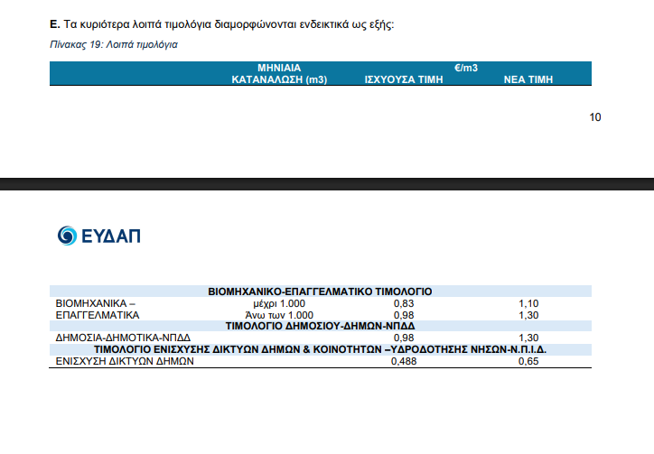 - Για το δημόσιο τους δήμους και τα ΝΠΔΔ, το τιμολόγιο ανεβαίνει, από 0,98 ευρώ το κυβικό μέτρο σε 1,3 ευρώ.