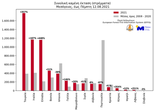 Εικόνα 2. Συνολική καμένη έκταση με βάση τα στοιχεία του EFFIS στις χώρες της Μεσογείου έως και το βράδυ της Πέμπτης 12 Αυγούστου 2021.