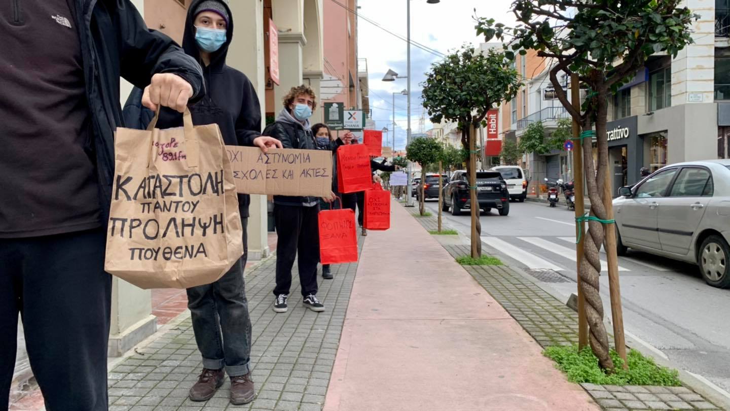 Με έναν συμβολικό τρόπο επέλεξαν να διαμαρτυρηθούν φοιτητές και φοιτήτριες στο Ρέθυμνο κατά της αστυνόμευσης στα πανεπιστήμια που προωθεί η κυβέρνηση αλλά και για την στοχευμένη απαγόρευση συναθροίσεων. Με συνθήματα γραμμένα πάνω σε τσάντες έκαναν «βόλτα» στην τοπική αγορά, εξάλλου κάτι τέτοιο δεν αντιβαίνει στις απαγορεύσεις.
