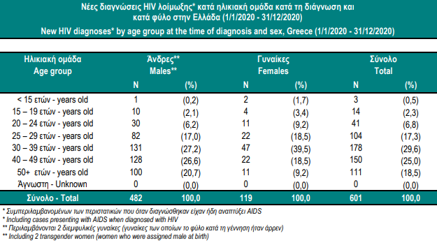 Σύμφωνα με το τελευταίο δελτίο επιδημιολογικής επιτήρησης της HIV Λοίμωξης, τo 2020 διαγνώστηκαν (έως 31/12/2020) και δηλώθηκαν (έως 09/03/2021) 601 νέα περιστατικά HIV, εκ των οποίων 482 (80,2%) αφορούσαν σε άνδρες και 119 (19,8%) σε γυναίκες. Από τις περιπτώσεις που διαγνώσθηκαν για πρώτη φορά με HIV το 2020, 86 (14,3%) άτομα είχαν ήδη εμφανίσει ή ανέπτυξαν κλινικά AIDS εντός του συγκεκριμένου έτους. To 42,6% των νέων διαγνώσεων αφορούσαν σε μεταδόσεις μέσω απροφύλακτης σεξουαλικής επαφής μεταξύ ανδρών, το 20% σε μεταδόσεις μέσω απροφύλακτης ετεροφυλοφιλικής σεξουαλικής επαφής, το 13,5% σε μεταδόσεις μέσω ενδοφλέβιας χρήσης εξαρτησιογόνων ουσιών, ενώ για το 23,3% των περιπτώσεων δεν έχει προσδιοριστεί ο τρόπος μετάδοσης του ιού. Τα περισσότερα περιστατικά, τόσο στους άνδρες (27,2%), όσο και στις γυναίκες (39,5%), ήταν ηλικίας 30-39 ετών κατά τη διάγνωση.