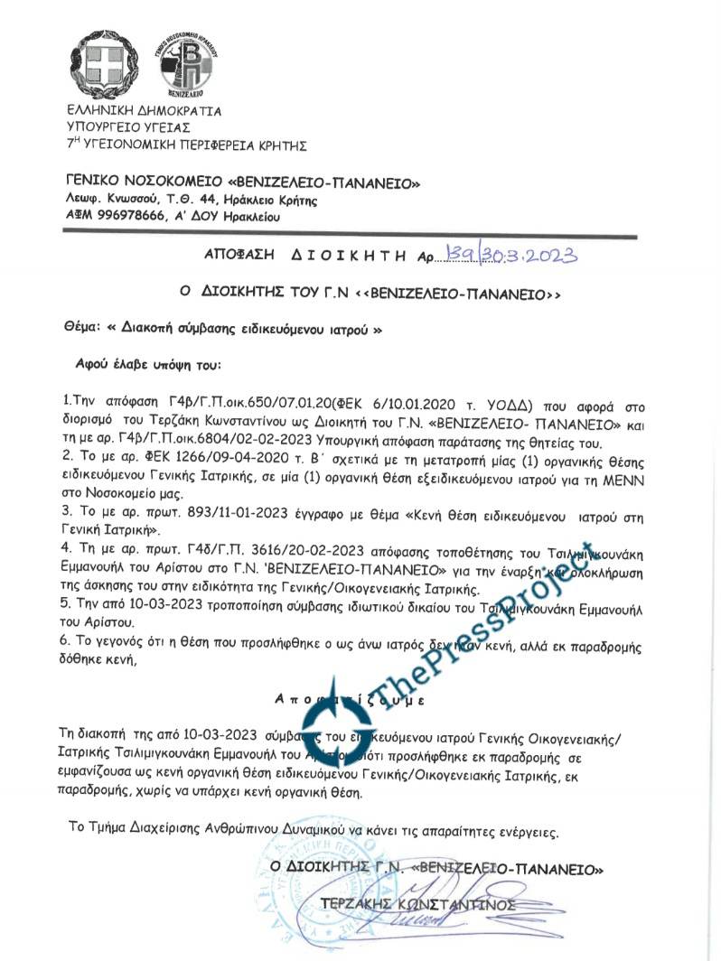 Διορίστηκε και υπηρετεί στη θέση του ειδικευομένου ιατρού γενικής/οικογενειακής ιατρικής από διμήνου, με σύμβαση 5ετούς διάρκειας, όσα και τα χρόνια της ειδίκευσής του. Ακολουθώντας το πρωτόκολλο και ως είθισται σε αυτές τις περιπτώσεις, τα απαραίτητα έγγραφα που προσκόμισε για την πρόσληψη και τον διορισμό μετακινήθηκαν και ελέγθησαν από τους εξής φορείς: Διεύθυνση Δημόσιας Υγείας Περιφέρειας Κρήτης, Τμήμα προσωπικού και Διοίκηση του νοσοκομείου και τέλος το αρμόδιο τμήμα του υπουργείου υγείας.