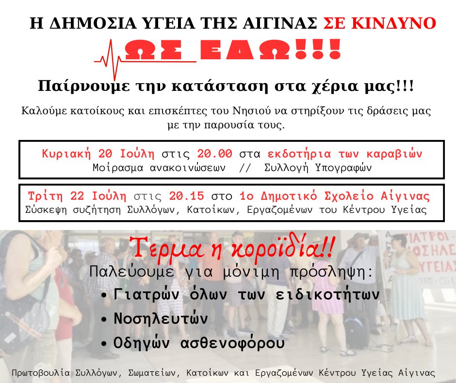 Η Πρωτοβουλία Συλλόγων, Σωματείων, εργαζόμενων στο Κέντρο Υγείας και κατοίκων της Αίγινας ενημερώνει ότι θα πραγματοποιηθεί συλλογή υπογραφών και μοίρασμα ανακοινώσεων στο λιμάνι της Αίγινας δίπλα στα εκδοτήρια, την Κυριακή 20/7, από τις 8μμ έως τις 10μμ.