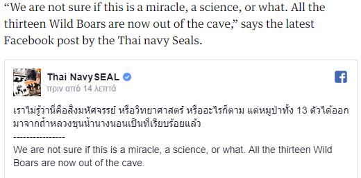 Διασώθηκαν και τα 13 άτομα που είχαν εγκλωβιστεί σε σπήλαιο της Ταϊλάνδης από τις 23 Ιουνίου. Τα άτομα αποτελούνταν από 12 παιδιά και τον προπονητή ποδοσφαίρου τους, ενώ η επιχείρηση διάσωσης διήρκεσε τρεις ημέρες. Τα παιδιά είναι καλά στην υγεία τους, με λίγα αναπνευστικά προβλήματα, ενώ πρόκειται να παραμείνουν στο νοσοκομείο για μία εβδομάδα, μέχρι να βρεθούν με τους γονείς τους.