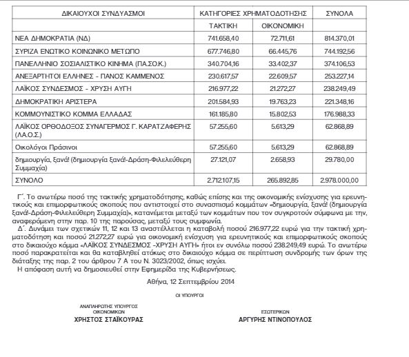 Η κατανομή των πόρων γίνεται με βάση το εκλογικό αποτέλεσμα του 2009 και του 2012 ενώ, όπως αναφέρεται και στην απόφαση, τα κονδύλια που αναλογούν στη Χρυσή Αυγή δεν θα αποδοθούν λόγω της σχετικής απόφασης που έχει λάβει η Ολομέλεια της Βουλής.